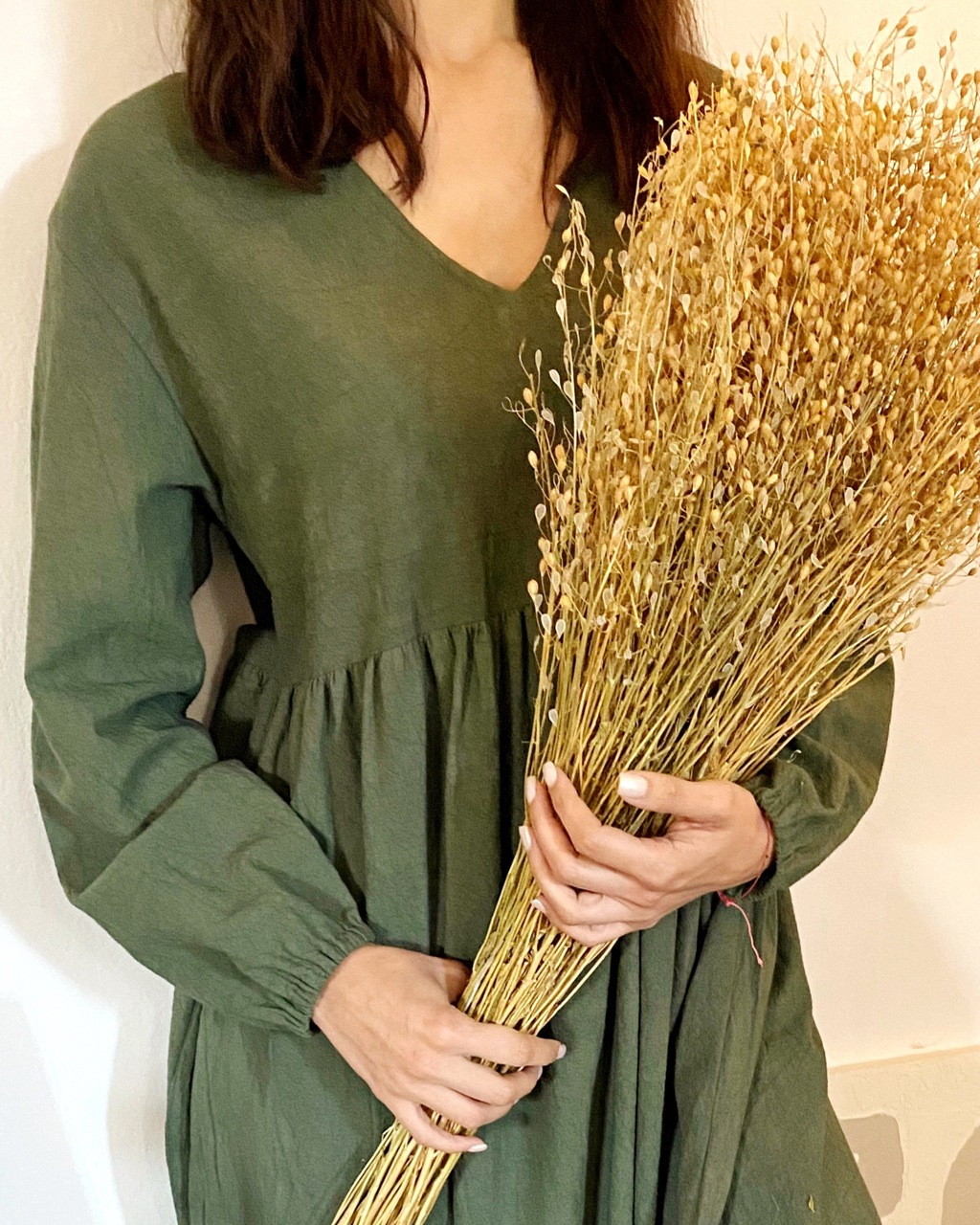 El Vestido Yöy está confeccionada en tusor teñido 100% algodón, posee mangas largas con goma elástica en sus puños para aportar volumen, incluye un cinturón para marcar la cintura si así lo deseas.